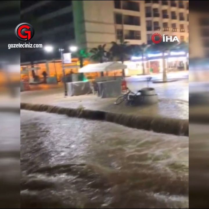 İzmir'de etkili olan kuvvetli sağanak nedeniyle bazı cadde ve sokaklar göle döndü. Çeşme'de çekilen bir videoda ise adeta denizle karanın birleştiği görüldü.