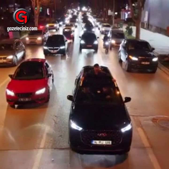 Kadıköy'de Caddebostan caddesinde sunroof'tan yolculuk yapan genç, dron kamerası fark edince araç içine girdi.