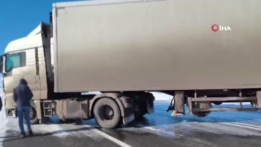 Kars-Gürcistan kara yolunda etkili olan kar yağışı ve buzlanma, ulaşımı durma noktasına getirdi. Yol yüzeyinin adeta buz pistine döndüğü bölgede çok sayıda tır kontrolden çıkarak makas attı, kara yolu trafiğe kapandı. Araçlarında mahsur kalan vatandaşlar için ekipler zorlu koşullarda çalışma yürütüyor.