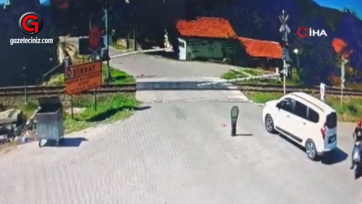 Zonguldak'ın Çaycuma ilçesinde hemzemin geçitten geçmeye çalışan motosiklet ile yolcu treni çarpıştı. Motosiklet sürücüsünün hafif şekilde yaralandığı kaza güvenlik kamerasına yansıdı.